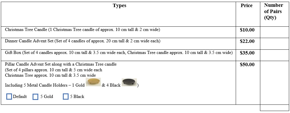 Complete the order form below along with payment, before the 28th of November and your candles will be ready for pick up on the 1st of December, from the Primary Campus.